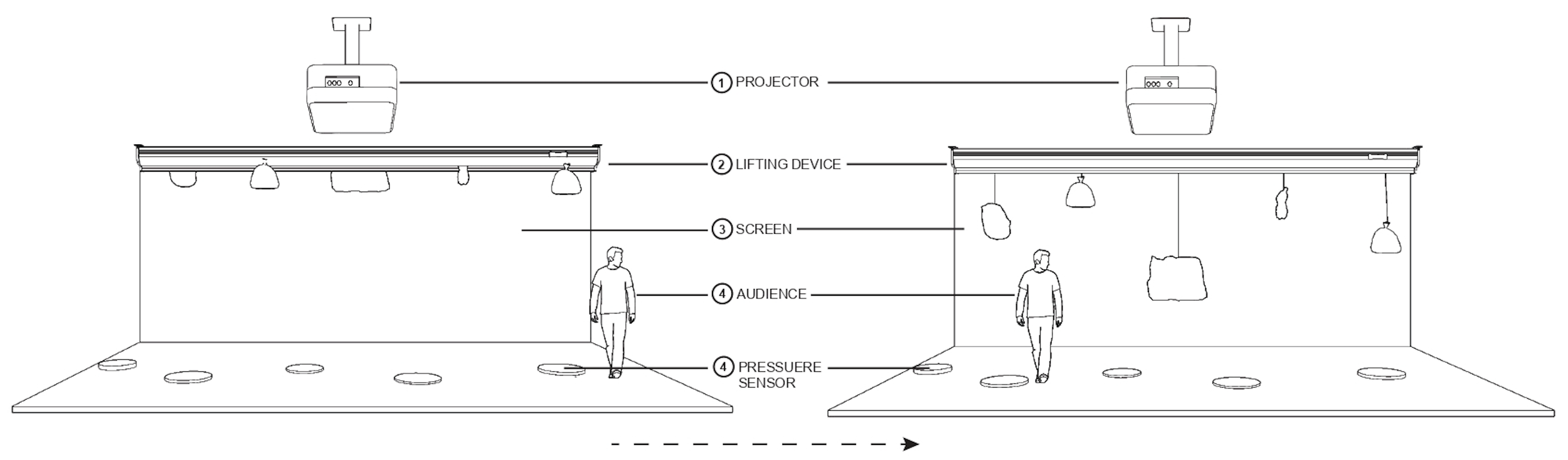 The system is organized around five primary components. A ceiling-mounted projector casts visuals toward a large frontal screen that serves as the main display surface. Suspended from an overhead lifting track are movable objects or panels that can be raised, lowered, or repositioned to alter the projected composition and spatial atmosphere. These hanging elements function both as sculptural components and as dynamic surfaces that can interrupt, catch, or reshape the projection.