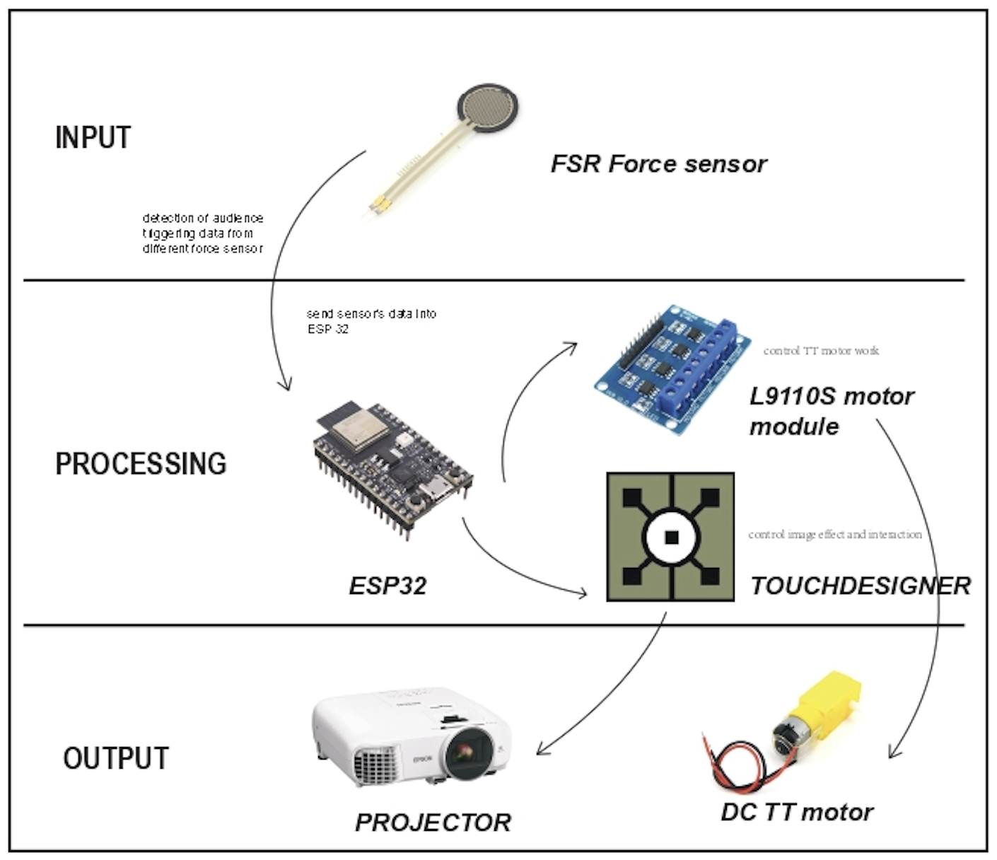 The installation uses an FSR force sensor to detect audience interaction through pressure or stepping. An ESP32 microcontroller processes this input and sends data to TouchDesigner, where real-time visuals are generated. The system also controls a DC TT motor through an L9110S driver to move physical elements in response to interaction. A projector outputs the visuals, linking body movement, mechanical response, and projected media into one interactive loop.